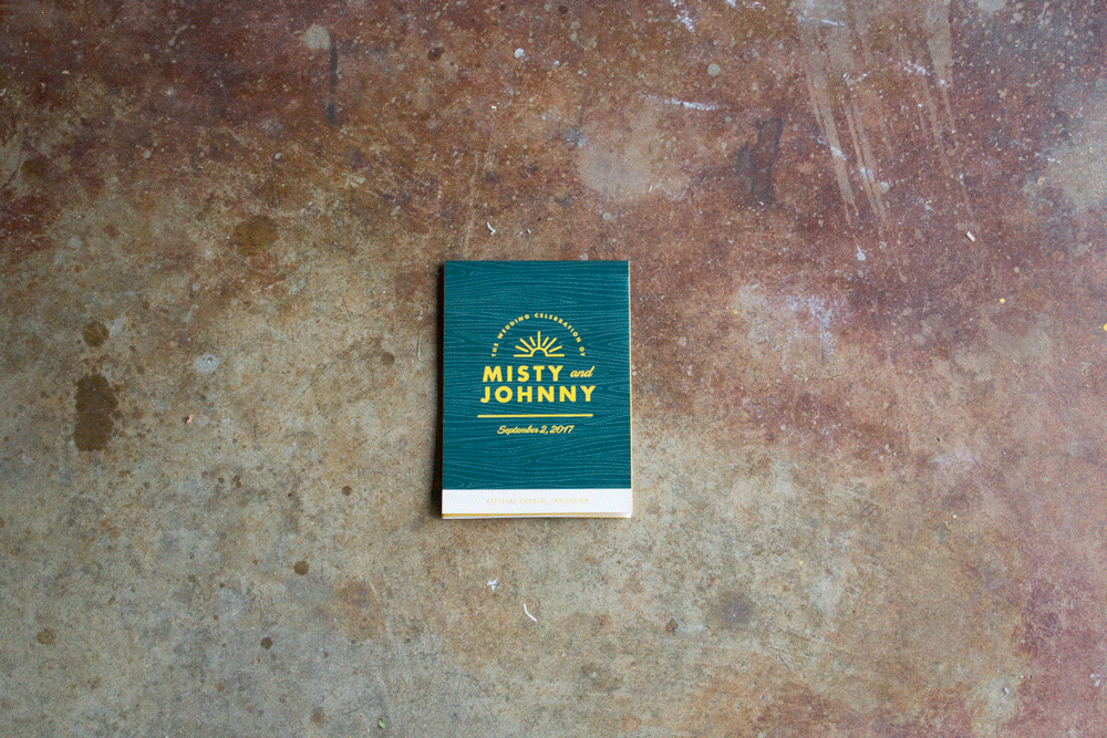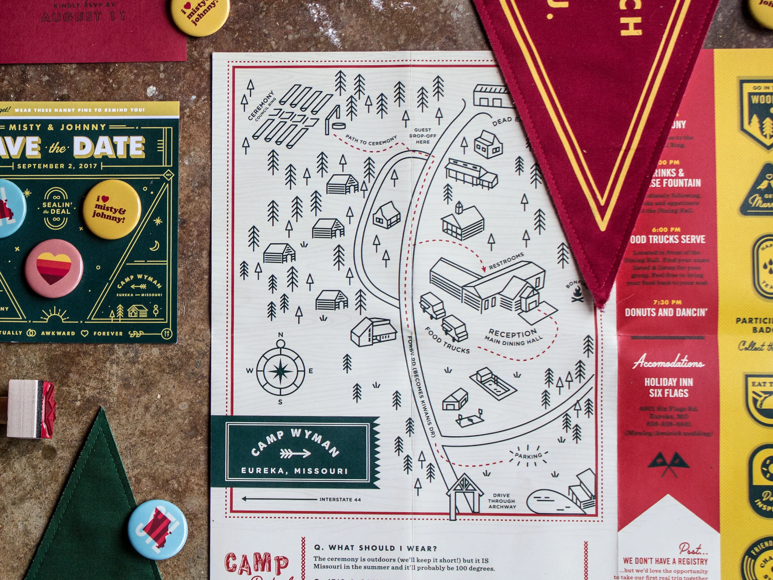 Designed my own suite of wedding collateral, including: save the date card with 3 buttons, a fold out invitation poster with map, RSVP card, custom stamps, wedding program flags, screen printed pennants for centerpieces, and menu card.